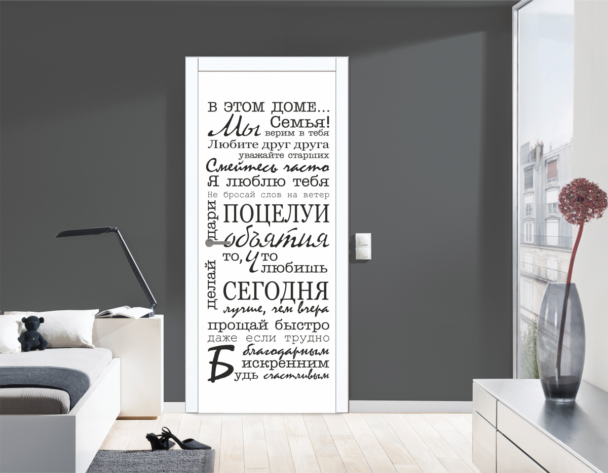 Межкомнатная дверь Impress Тёплые слова, Экошпон, Шагрень белая, Кромка белая, Рисунок с одной стороны